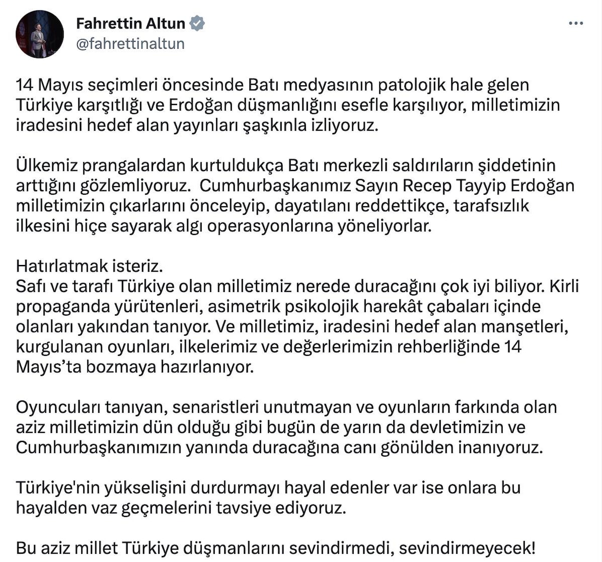 İletişim Başkanı Fahrettin Altun açıklamasının tamamında şu ifadeleri kullandı: