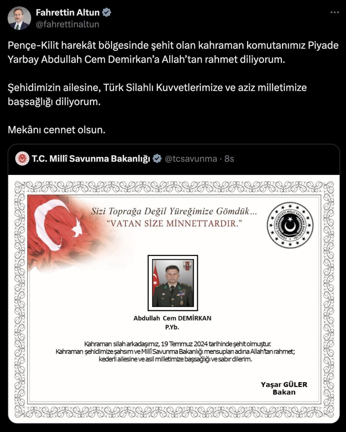 Altun, sosyal medya hesabından yaptığı paylaşımda, "Pençe-Kilit harekat bölgesinde şehit olan kahraman komutanımız Piyade Yarbay Abdullah Cem Demirkan’a Allah'tan rahmet diliyorum. Şehidimizin ailesine, Türk Silahlı Kuvvetlerimize ve aziz milletimize başsağlığı diliyorum. Mekanı cennet olsun." ifadesini kullandı.
