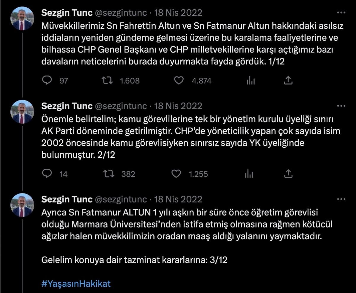 Tunç, Cumhuriyet gazetesi hakkındaki davanın da sonuçlandığını belirterek, "Cumhuriyet gazetesinin Sayın Fahrettin Altun'a yönelik asılsız ve mesnetsiz iddialar içeren ve tümü için tekzip yayınladığı haberleri sebebi ile ikame ettiğimiz davanın istinaf incelemesinde gazete aleyhine 20 bin lira manevi tazminat ödemesine karar verildi." ifadelerini kullandı.