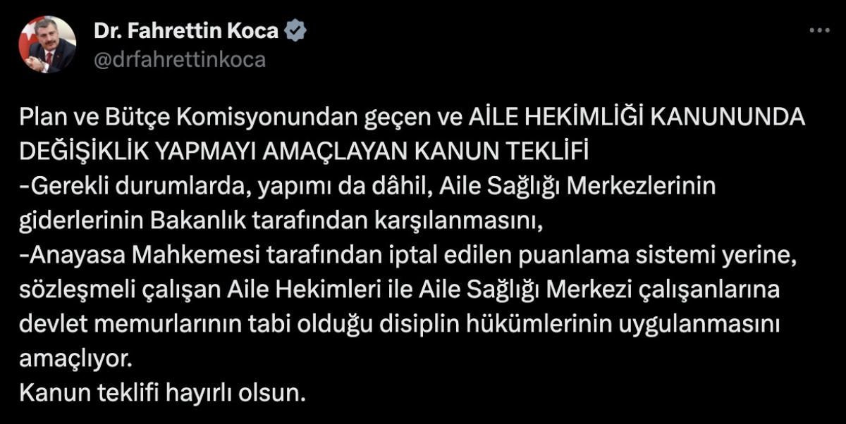 Bakan Koca, kanun teklifi çerçevesinde gerekli durumlarda Aile Sağlığı Merkezlerinin giderlerinin Bakanlık tarafından karşılanabileceğini kaydederek, “Gerekli durumlarda, yapımı da dâhil, Aile Sağlığı Merkezlerinin giderlerinin Bakanlık tarafından karşılanmasını, Anayasa Mahkemesi tarafından iptal edilen puanlama sistemi yerine, sözleşmeli çalışan Aile Hekimleri ile Aile Sağlığı Merkezi çalışanlarına devlet memurlarının tabi olduğu disiplin hükümlerinin uygulanmasını amaçlıyor” ifadelerini kullandı.
