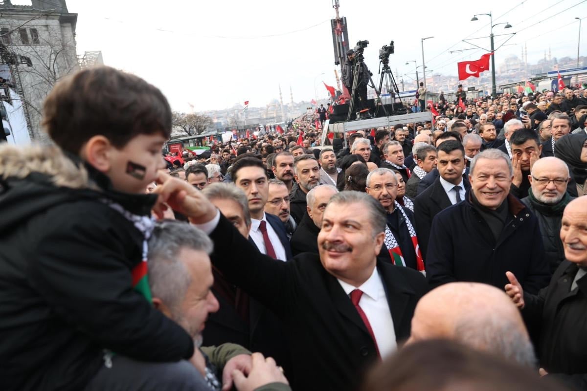 "Şehitlerimize Rahmet, Filistin'e Destek, İsrail'e Lanet" sloganıyla yürüyüşe başlayan binlerce vatandaşa Sağlık Bakanı Fahrettin Koca ve diğer bakanlar eşlik ediyor.
