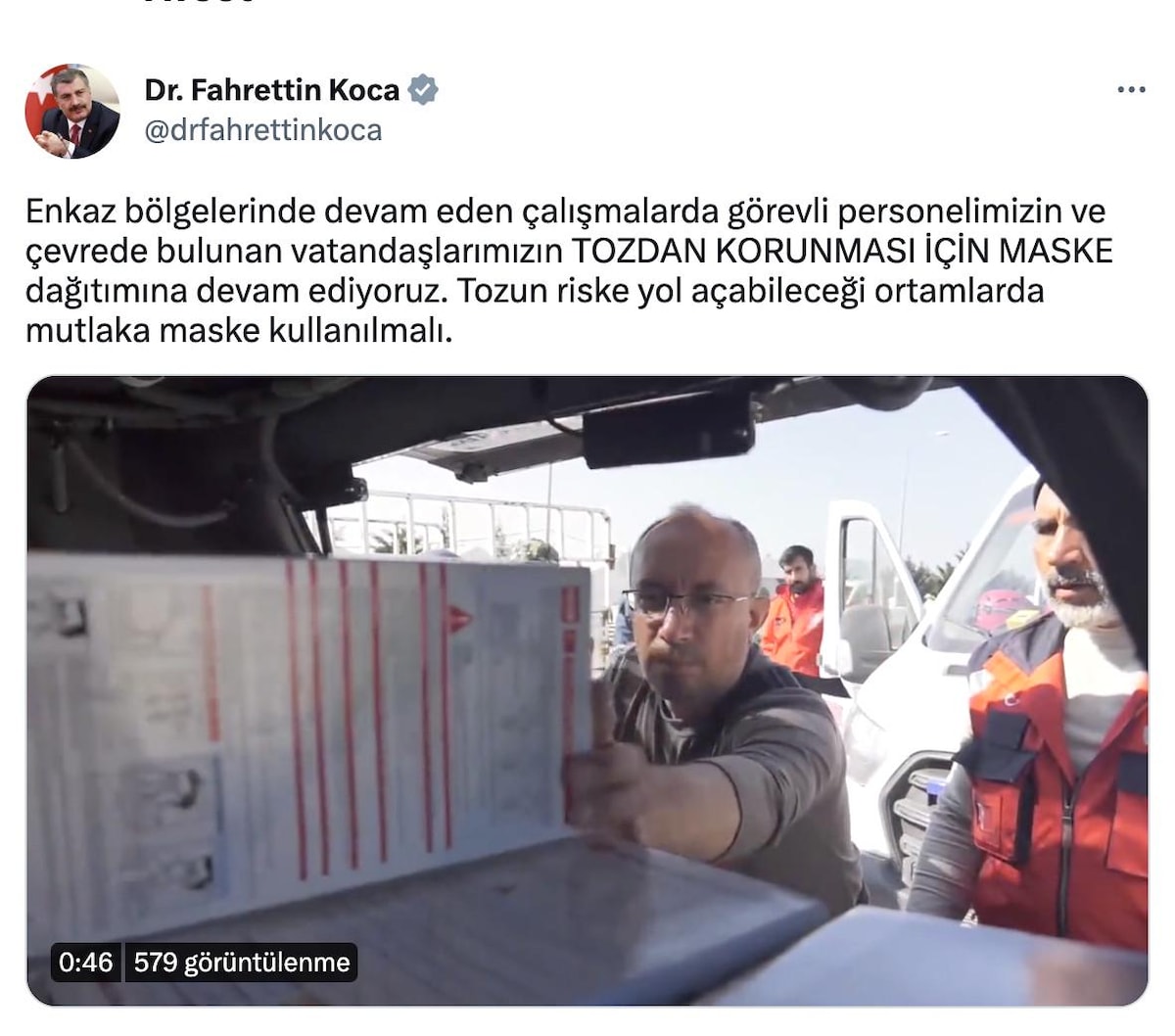 "Enkaz bölgelerinde devam eden çalışmalarda görevli personelimizin ve çevrede bulunan vatandaşlarımızın tozdan korunması için maske dağıtımına devam ediyoruz. Tozun riske yol açabileceği ortamlarda mutlaka maske kullanılmalı."