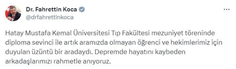 Sağlık Bakanı Fahrettin Koca, Hataylı öğrencilerin depremde hayatını kaybeden öğrenci ve hekimleri andıkları duygu dolu anları paylaşarak, "Sevinç ile üzüntü bir arada" notunu ekledi.
