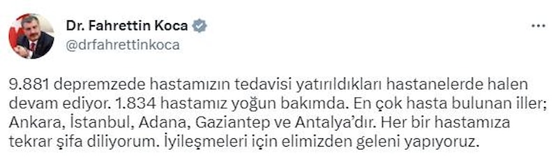 9 bin 881 depremzede hastamızın tedavisi yatırıldıkları hastanelerde halen devam ediyor. Bin 834 hastamız yoğun bakımda. En çok hasta bulunan iller; Ankara, İstanbul, Adana, Gaziantep ve Antalya’dır. Her bir hastamıza tekrar şifa diliyorum. İyileşmeleri için elimizden geleni yapıyoruz.