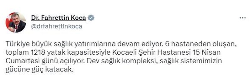 Son olarak Sağlık Bakanı Fahrettin Koca, bir müjdeyi daha duyurdu ve Kocaeli Şehir Hastanesi'nin 15 Nisan Cumartesi günü açılacağını belirtti.