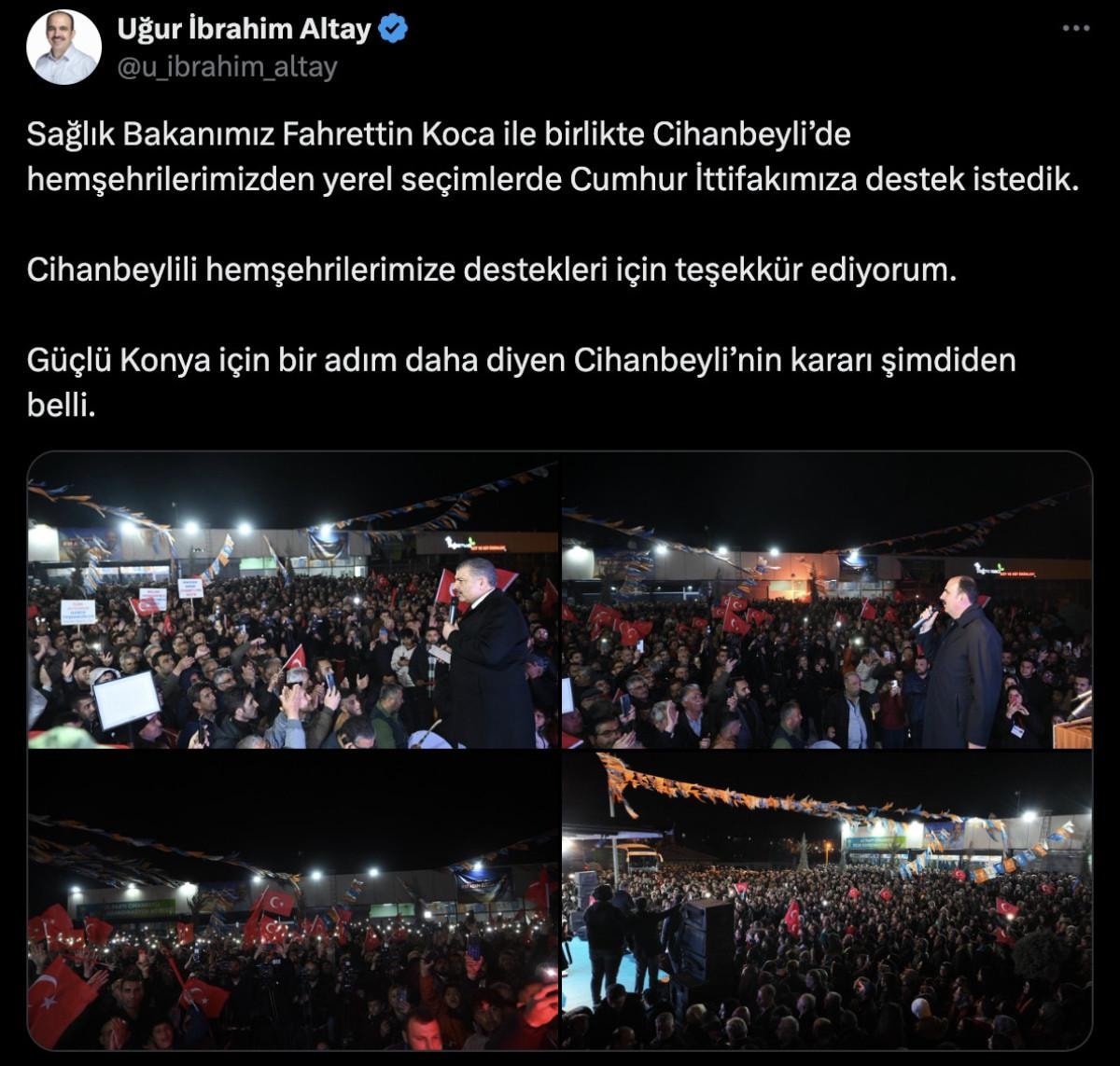 Sosyal medya hesabından buluşmaya ilişkin bir paylaşım yapan Konya Büyükşehir Belediye Başkanı Uğur İbrahim Altay, "Sağlık Bakanımız Fahrettin Koca ile birlikte Cihanbeyli'de hemşehrilerimizden yerel seçimlerde Cumhur İttifakımıza destek istedik. Cihanbeylili hemşehrilerimize destekleri için teşekkür ediyorum. Güçlü Konya için bir adım daha diyen Cihanbeyli'nin kararı şimdiden belli." ifadelerini kullandı.