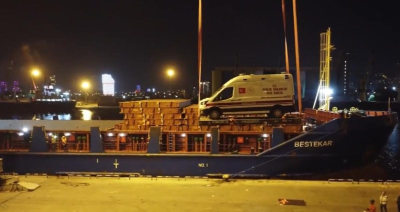 İzmir Alsancak Limanı’na demirleyen kuru yük gemisine, görevliler tarafından 51 konteyner tıbbi malzeme ve jeneratörle 20 tam donanımlı ambulans yüklendi.