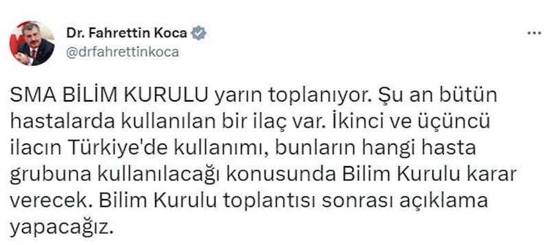 SMA Bilim Kurulu yarın toplanıyor. Şu an bütün hastalarda kullanılan bir ilaç var. İkinci ve üçüncü ilacın Türkiye'de kullanımı, bunların hangi hasta grubuna kullanılacağı konusunda Bilim Kurulu karar verecek. Bilim Kurulu toplantısı sonrası açıklama yapacağız.