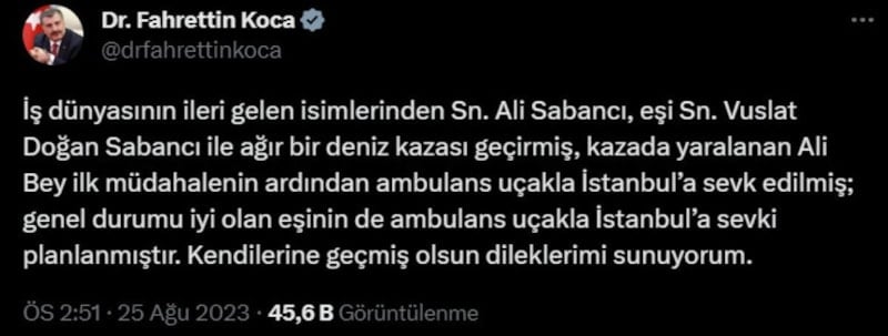 Bakan Fahrettin Koca, "İş dünyasının ileri gelen isimlerinden Sn. Ali Sabancı, eşi Sn. Vuslat Doğan Sabancı ile ağır bir deniz kazası geçirmiş, kazada yaralanan Ali Bey ilk müdahalenin ardından ambulans uçakla İstanbul’a sevk edilmiş; genel durumu iyi olan eşinin de ambulans uçakla İstanbul’a sevki planlanmıştır. Kendilerine geçmiş olsun dileklerimi sunuyorum." ifadelerini kullandı.