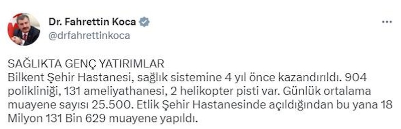 Sağlık Bakanı Fahrettin Koca, Avrupa’nın en büyük, dünyanın ise 3. büyük Ankara Şehir Hastanesi'nde verilen hizmeti, "Sağlıkta genç yatırımlar" notuyla paylaştı.