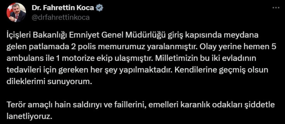 İçişleri Bakanlığı Emniyet Genel Müdürlüğü giriş kapısında meydana gelen patlamada 2 polis memurumuz yaralanmıştır.