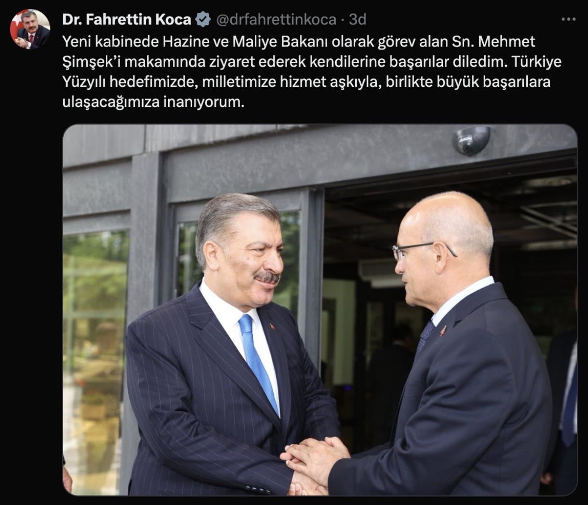 Koca paylaşımında, "Yeni kabinede Hazine ve Maliye Bakanı olarak görev alan Sn. Mehmet Şimşek’i makamında ziyaret ederek kendilerine başarılar diledim. Türkiye Yüzyılı hedefimizde, milletimize hizmet aşkıyla, birlikte büyük başarılara ulaşacağımıza inanıyorum." ifadelerini kullandı.