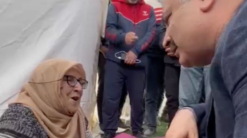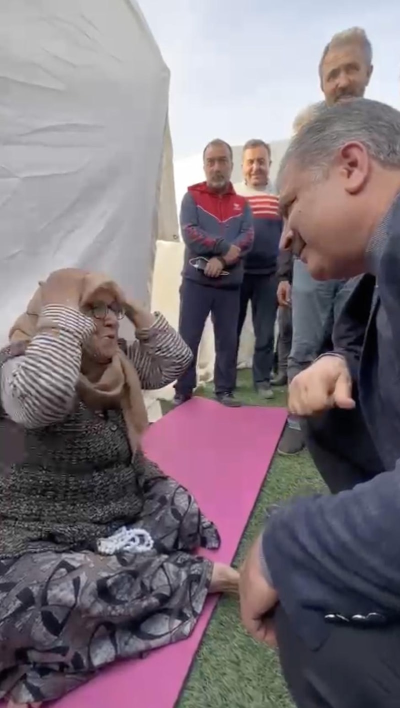 Yakın zamanda evini kaybeden deprem mağduru yaşlı kadın Bakan Koca ve Cumhurbaşkanı Recep Tayyip Erdoğan'a, "Allah'ım başımızdan eksik etmesin sizi. Başkanımızı başımızdan düşürmesin. Başkanımızı görsem çok seviniri. O bizim babamız. İşi gücü rast gelsin." sözleriyle dualar etti.
