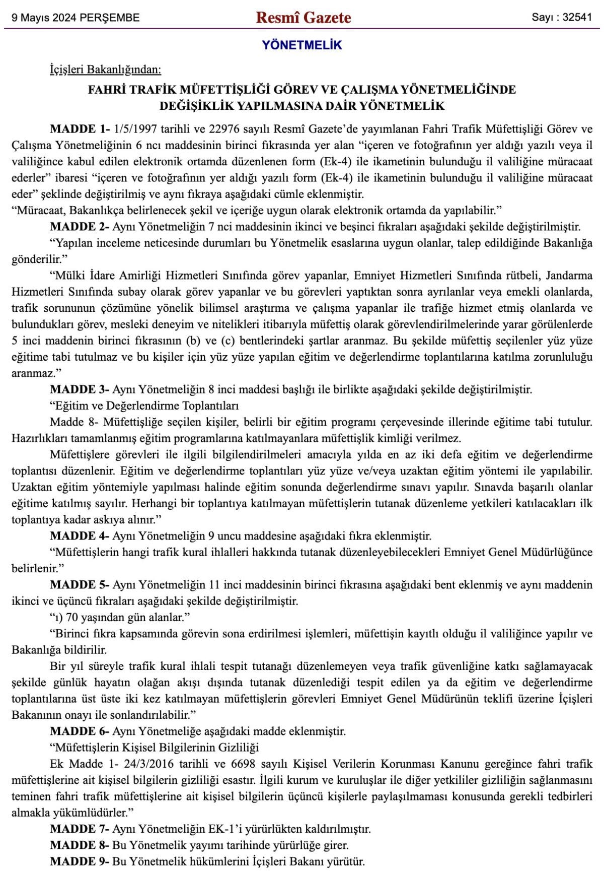 Fahri Trafik Müfettişliği Görev ve Çalışma Yönetmeliğinde Değişiklik Yapılmasına Dair Yönetmelik, Resmi Gazete'de yayınlanarak yürürlüğe girdi.