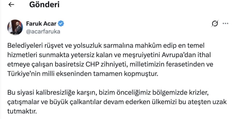 AK Parti Genel Başkan Yardımcısı ve Tanıtım ve Medya Başkanı Faruk Acar ise sosyal medya hesabından yaptığı paylaşımda, CHP'nin milletin ekseninden yoksun olduğunu söyledi.
