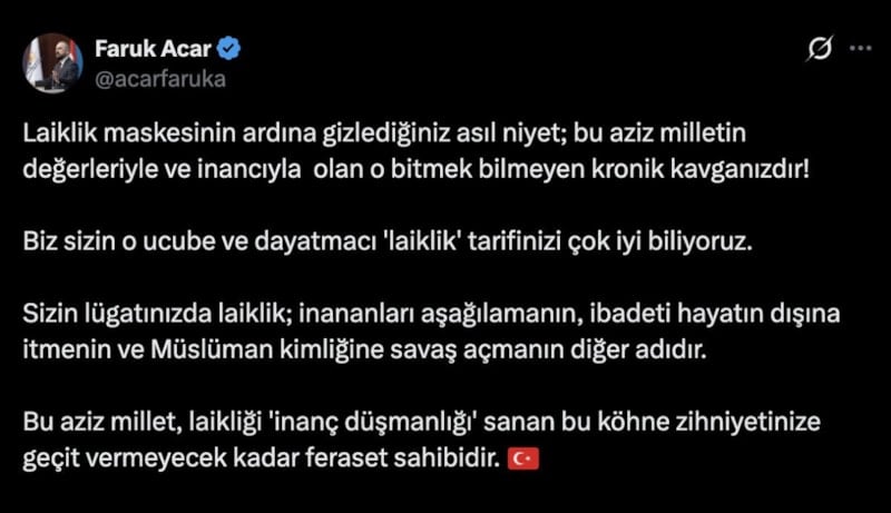 Türk Tabipler Birliği'nin 'Laikliği Savunmak Suç Değil, Tarihsel Bir Görevdir' açıklamasına tepki gösteren AK Parti Genel Başkan Yardımcısı Faruk Acar, "Asıl niyet; bu aziz milletin değerleriyle ve inancıyla olan o bitmek bilmeyen kronik kavganızdır" dedi.