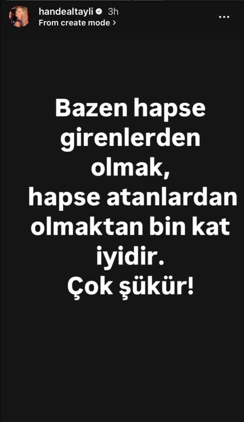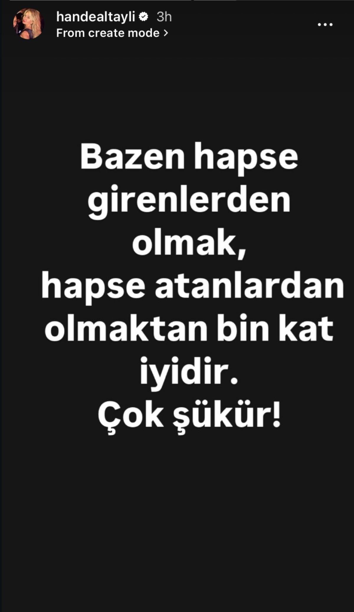 Sosyal medya hesabı üzerinden paylaşımda bulunan Hande Altaylı, "Bazen hapse girenlerden olmak, hapse atanlardan olmaktan bin kat iyidir. Çok şükür!" ifadesinde bulundu.