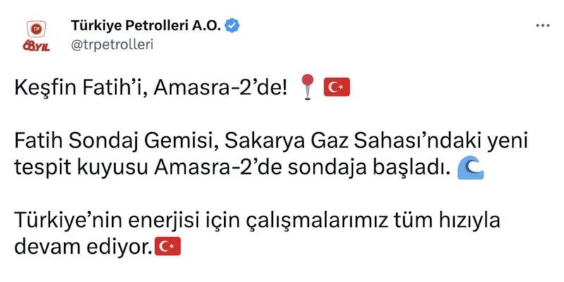 Türkiye Petrolleri Anonim Ortaklığı, Fatih Sondaj Gemisi'nin Amasra-2'de yeni sondaj çalışmalarına başladığını duyurdu.