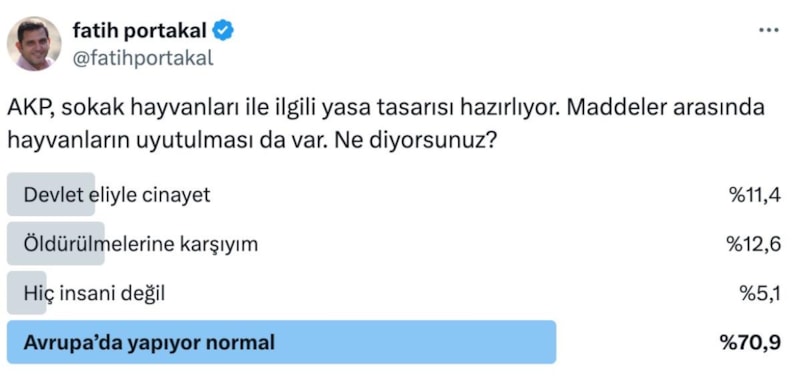 Fatih Portakal'ın, sokak köpeklerinin sahiplendirilememesi durumunda uyutulmasını öngören düzenleme için yaptığı sosyal medya anketinde katılımcıların yüzde 70,9'u uygulamanın doğru olduğunu savundu.
