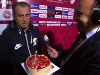 A Milli Takımımız'ın Danimarka'yı 2-1 yendiği mücadelede sonrası Türkiye Futbol Direktörü Fatih Terim, Show TV mikrofonlarına konuştu. Karşılaşma sonrası Show TV Spor Spikeri Fatih Kuşçu'ya konuşan Fatih Terim'e canlı yayında yarın doğum günü olduğu için pasta sürprizi yapıldı.