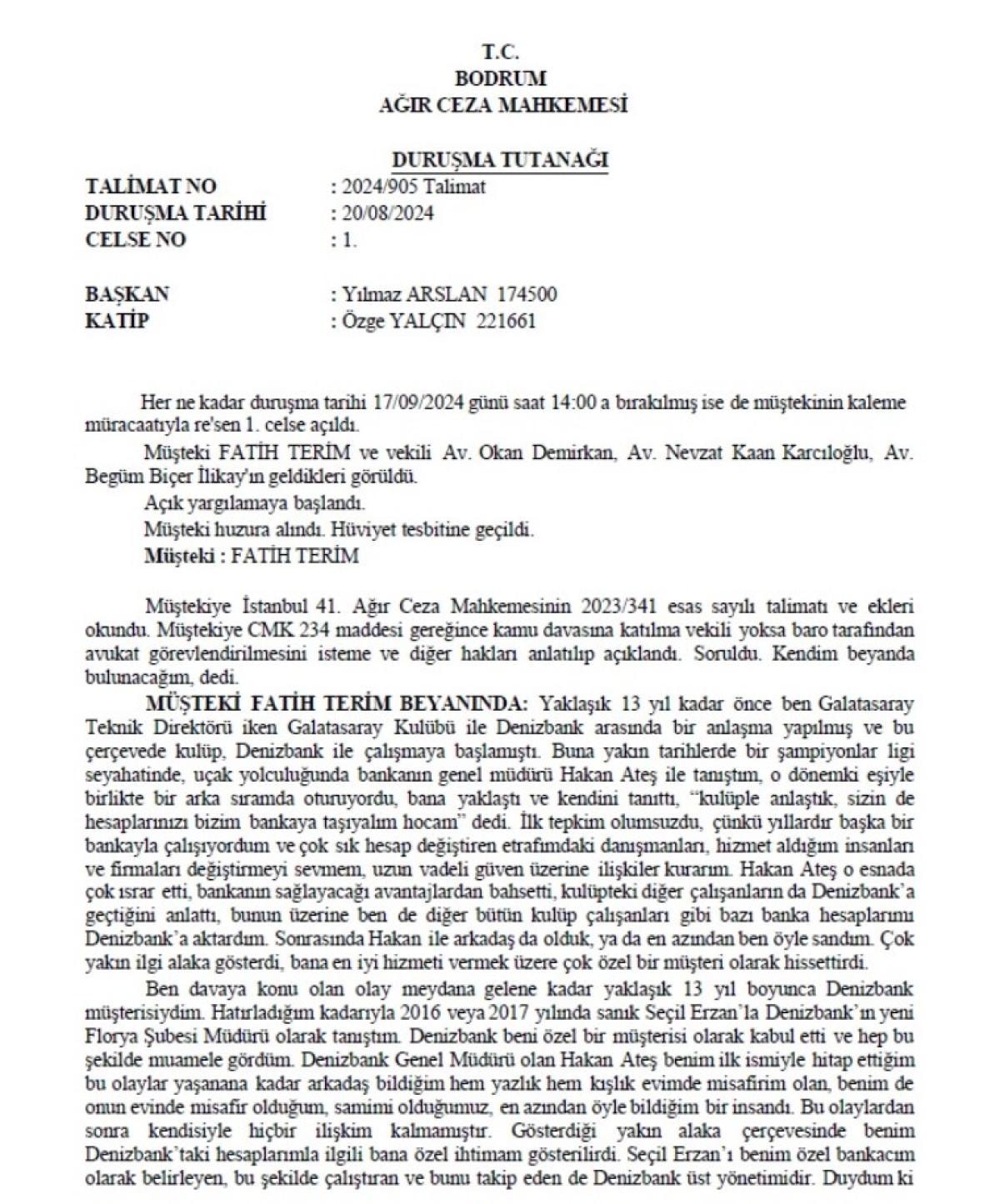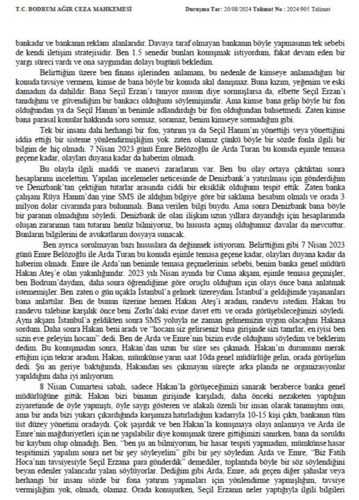 Son olarak Seçil Erzan'ın kendisine, “Hocam bankada şu kadar paranız var, bu ay bu paraya dokunmadınız heba olmasın, değerlendirelim.” dediğini de iddia eden Fatih Terim'in ifadesinden öne çıkanlar...