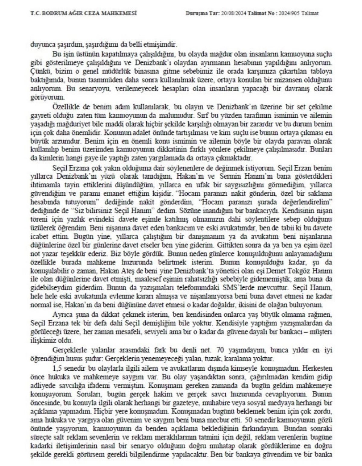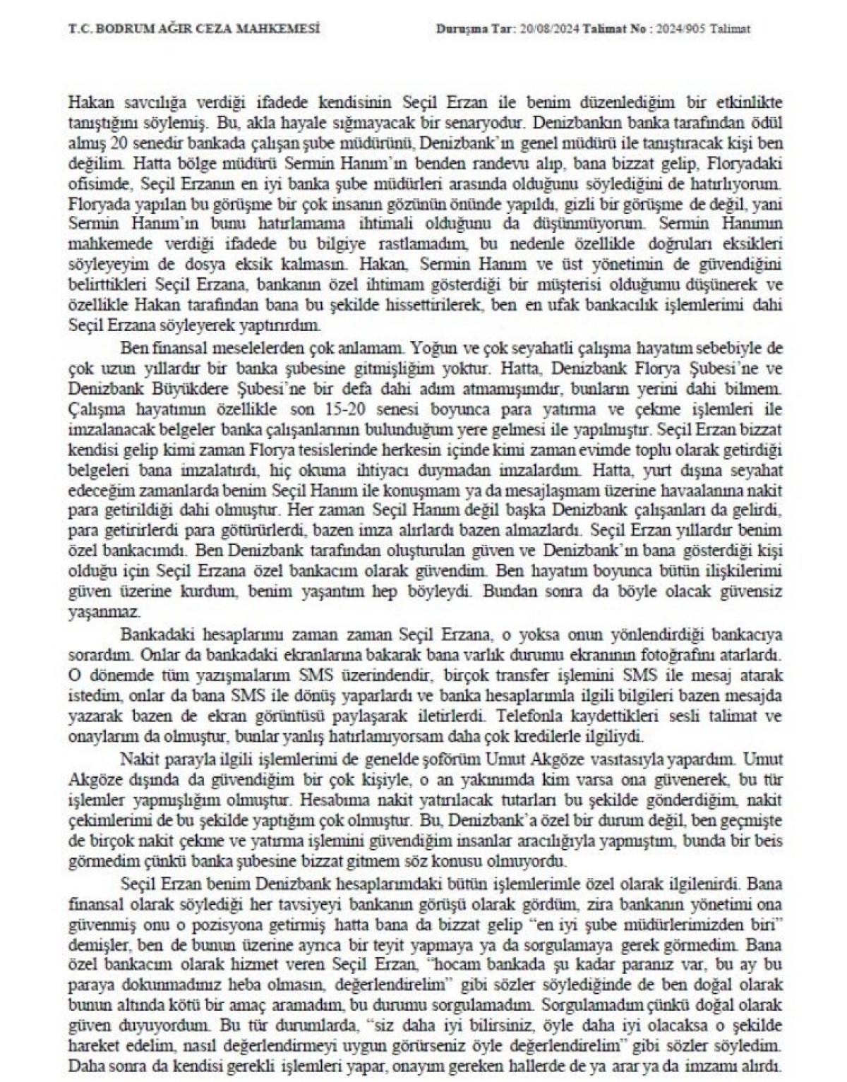 Hatta, yurt dışına seyahat edeceğim zamanlarda benim Seçil Hanım ile konuşmam ya da mesajlaşmam üzerine havaalanına nakit para getirildiği dahi olmuştur. Her zaman Seçil Hanım değil başka Denizbank çalışanları da gelirdi, para getirirlerdi para götürürlerdi, bazen imza alırlardı bazen almazlardı. Seçil Erzan yıllardır benim özel bankacımdı. Ben Denizbank tarafından oluşturulan güven ve Denizbank’ın bana gösterdiği kişi olduğu için Seçil Erzan'a özel bankacım olarak güvendim. Ben hayatım boyunca bütün ilişkilerimi güven üzerine kurdum, benim yaşantım hep böyleydi. Bundan sonra da böyle olacak güvensiz yaşanmaz. Bankadaki hesaplarımı zaman zaman Seçil Erzan'a, o yoksa onun yönlendirdiği bankacıya sorardım. Onlar da bankadaki ekranlarına bakarak bana varlık durumu ekranının fotoğrafını atarlardı. O dönemde tüm yazışmalarım SMS üzerindendir, birçok transfer işlemini SMS ile mesaj atarak istedim, onlar da bana SMS ile dönüş yaparlardı ve banka hesaplarımla ilgili bilgileri bazen mesajda yazarak bazen de ekran görüntüsü paylaşarak iletirlerdi.