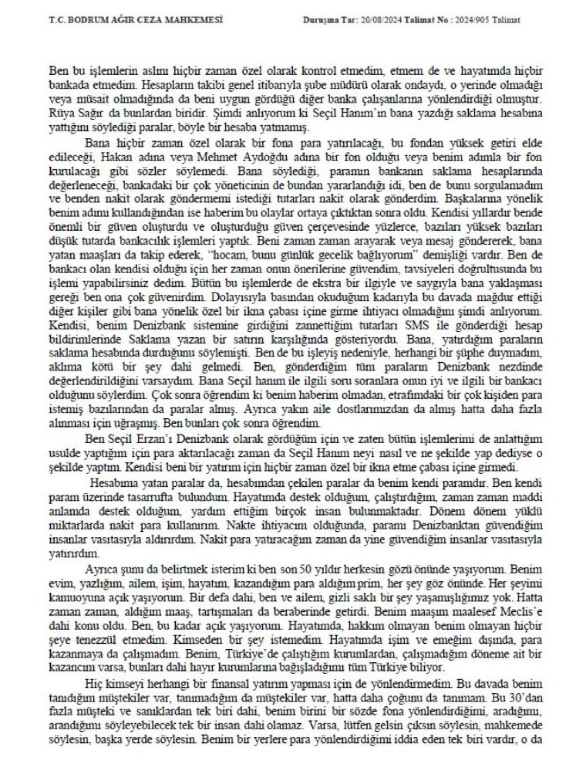 Bana özel bankacım olarak hizmet veren Seçil Erzan, “Hocam bankada şu kadar paranız var, bu ay bu paraya dokunmadınız heba olmasın, değerlendirelim” gibi sözler söylediğinde de ben doğal olarak bunun altında kötü bir amaç aramadım, bu durumu sorgulamadım. Sorgulamadım çünkü doğal olarak güven duyuyordum. Bu tür durumlarda, “Siz daha iyi bilirsiniz, öyle daha iyi olacaksa o şekilde hareket edelim, nasıl değerlendirmeyi uygun görürseniz öyle değerlendirelim” gibi sözler söyledim. Daha sonra da kendisi gerekli işlemleri yapar, onayım gereken hallerde de ya arar ya da imzamı alırdı. Ben bu işlemlerin aslını hiçbir zaman özel olarak kontrol etmedim, etmem de ve hayatımda hiçbir bankada etmedim. Hesapların takibi genel itibarıyla şube müdürü olarak ondaydı, o yerinde olmadığı veya müsait olmadığında da beni uygun gördüğü diğer banka çalışanlarına yönlendirdiği olmuştur. Rüya Sağır da bunlardan biridir. Şimdi anlıyorum ki Seçil Hanım’ın bana yazdığı saklama hesabına yattığını söylediği paralar, böyle bir hesaba yatmamış.