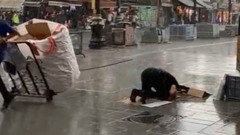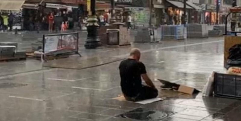 Fatih Beyazıt’ta cuma namazı için cami avlusunda bir vatandaş sağanak yağmura aldırış etmeden namaz kılmaya devam etti.