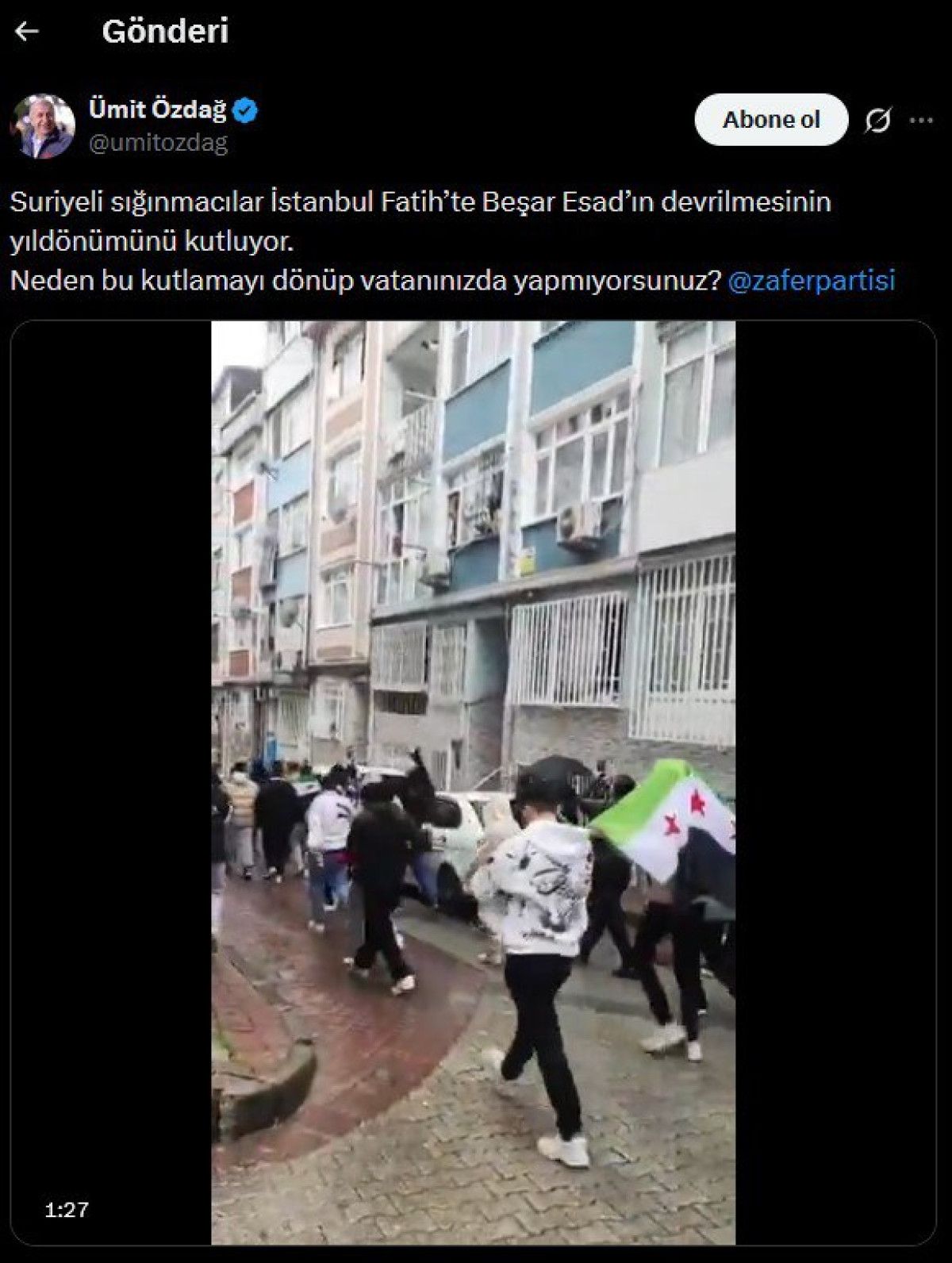 13 yıllık iç savaş sonunda Baas rejiminin esaretinden kurtulan Suriyeliler ellerinde bayraklarla sloganlar atarken Zafer Partisi Genel Başkanı Ümit Özdağ, görüntülerden rahatsız oldu.