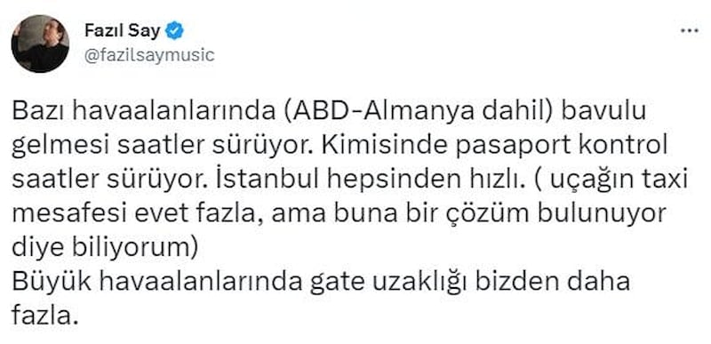 Piyanist Fazıl Say, İstanbul Havalimanı deneyimini paylaşarak methiyeler dizdi. Say, "Dünyadaki bütün havaalanlarını biliyorum. Yeni havaalanımız dünyanın en iyisidir, birçok açıdan" dedi.