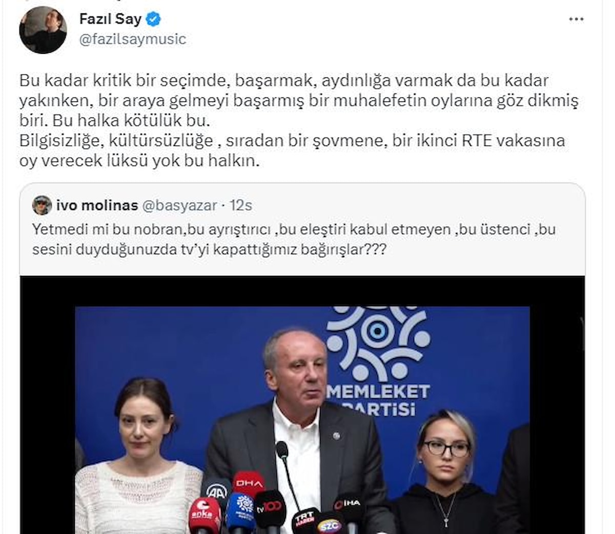 İnce'nin, bazı sanatçılara paylaşımları için tepki gösterdiği ve "sözde sanatçı" dediği anları alıntılayan Say, "Bu kadar kritik bir seçimde, başarmak, aydınlığa varmak da bu kadar yakınken, bir araya gelmeyi başarmış bir muhalefetin oylarına göz dikmiş biri. Bu halka kötülük bu. Bilgisizliğe, kültürsüzlüğe , sıradan bir şovmene, bir ikinci RTE vakasına oy verecek lüksü yok bu halkın" ifadelerini kullandı.