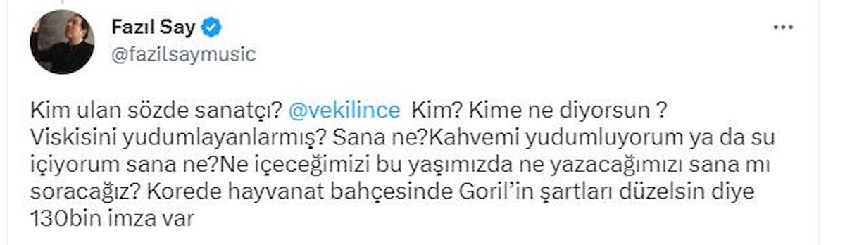 Kim ulan sözde sanatçı? @vekilince Kim? Kime ne diyorsun ? Viskisini yudumlayanlarmış? Sana ne?Kahvemi yudumluyorum ya da su içiyorum sana ne?Ne içeceğimizi bu yaşımızda ne yazacağımızı sana mı soracağız? Korede hayvanat bahçesinde Goril’in şartları düzelsin diye 130 bin imza var."