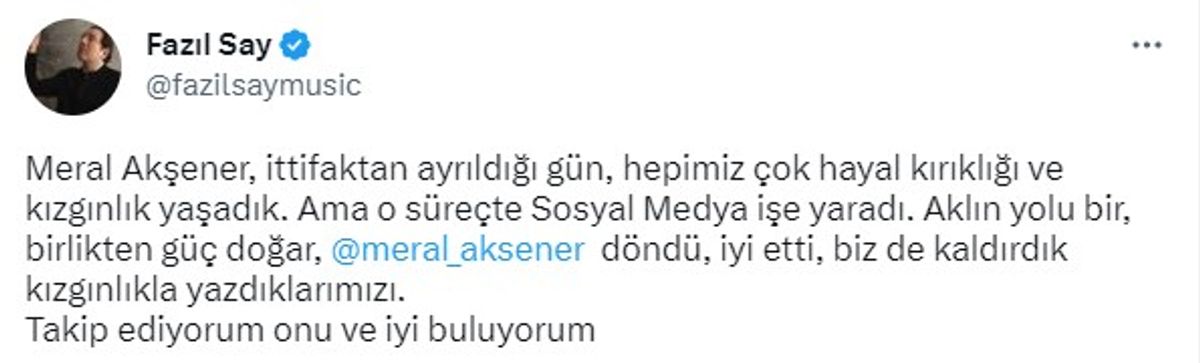 Meral Akşener, ittifaktan ayrıldığı gün, hepimiz çok hayal kırıklığı ve kızgınlık yaşadık. Ama o süreçte sosyal medya işe yaradı. Aklın yolu bir, birlikten güç doğar, Meral Akşener döndü, iyi etti, biz de kaldırdık kızgınlıkla yazdıklarımızı. Takip ediyorum onu ve iyi buluyorum.