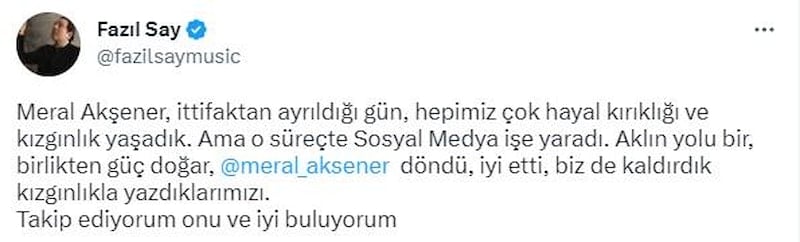 Fazıl Say, Kemal Kılıçdaroğlu'nun adaylığına onay vermediği için hakaretler savurduğu Meral Akşener için fikrini değiştirerek övgüyle bahsetti.