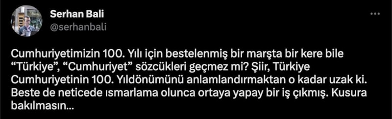 Bali, Twitter'dan yaptığı açıklamada "Cumhuriyetimizin 100. Yılı için bestelenmiş bir marşta bir kere bile “Türkiye”, “Cumhuriyet” sözcükleri geçmez mi? Şiir, Türkiye Cumhuriyetinin 100. Yıldönümünü anlamlandırmaktan o kadar uzak ki. Beste de neticede ısmarlama olunca ortaya yapay bir iş çıkmış. Kusura bakılmasın…" dedi.