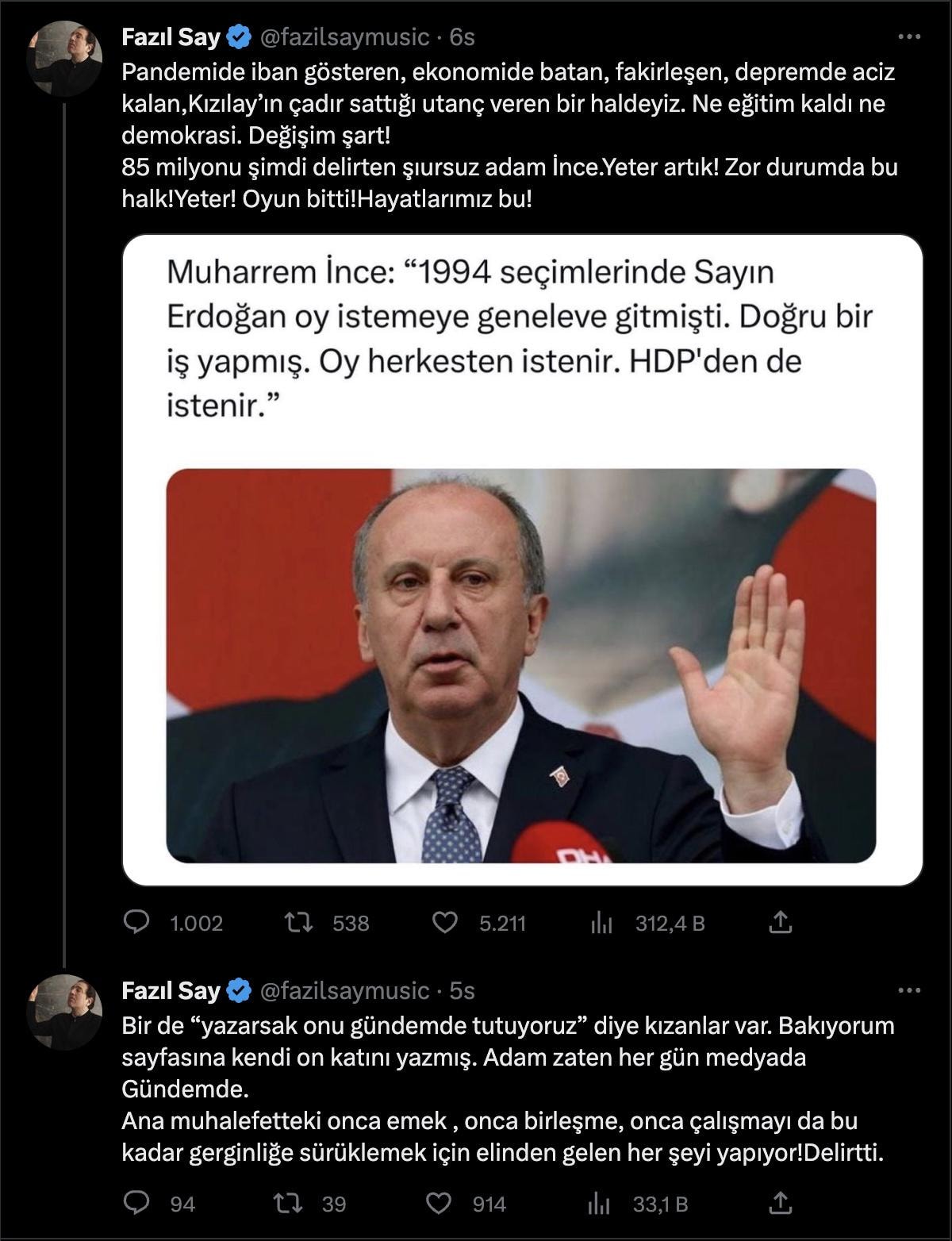 İnce'nin eleştirilerinin ardından Fazıl Say, dayanamayarak Twitter'dan eleştirilerini sürdürdü.
