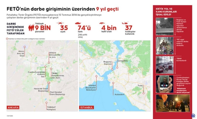 Fetullahçı Terör Örgütü (FETÖ) mensuplarınca 15 Temmuz 2016'da gerçekleştirilen darbe girişiminin üzerinden 9 yıl geçti.