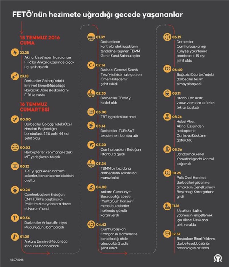 FETÖ elebaşı Gülen'in "haki renk" cübbesiyle verdiği talimatın ardından planlanan darbe girişiminin üzerinden 9 yıl geçti. Asker ve sivil 253 kişinin örgüt mensuplarınca şehit edildiği darbe girişimi, yaklaşık 21 saatte bastırıldı.