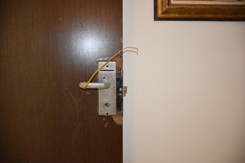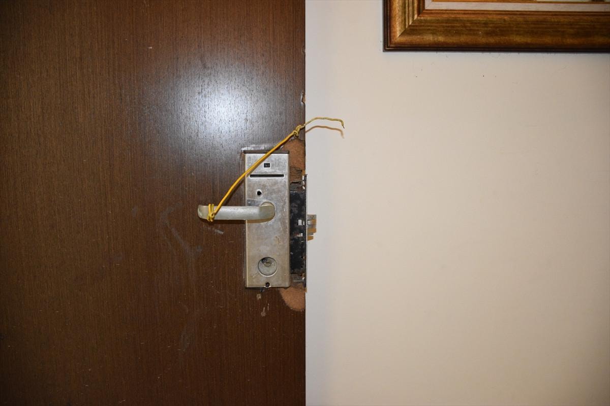 Suikast timinin saldırısı sırasında çatışmanın yaşandığı otel odasında darbecilere karşı koyan bir koruma polisine ait kelepçe, kan izleri bulunan yatağın üzerinde dururken bir kanepenin üzerinde 18 kurşun izi dikkatleri çekiyor.