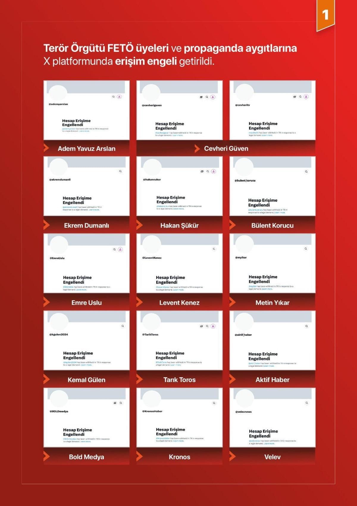 FETÖ'nün propaganda aygıtı konumunda olan ve psikolojik harekat yürüten 119 sosyal medya kullanıcısına, X platformunda erişim engeli getirildi.