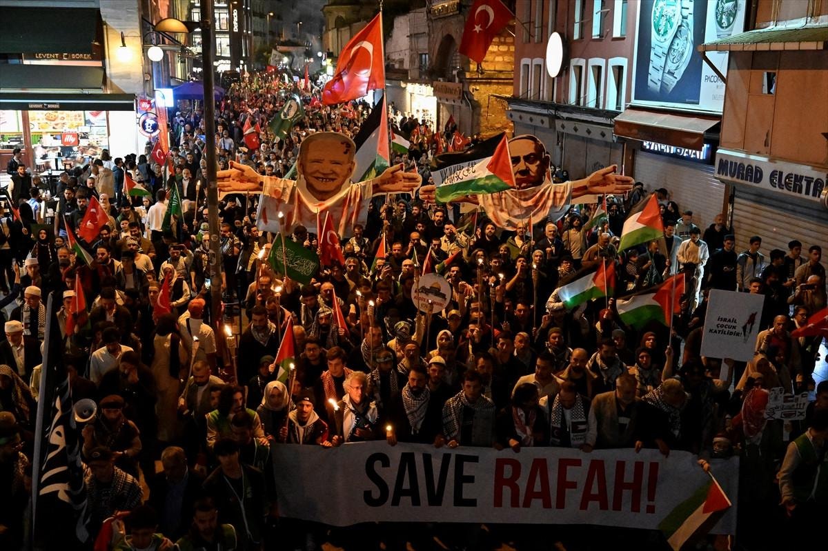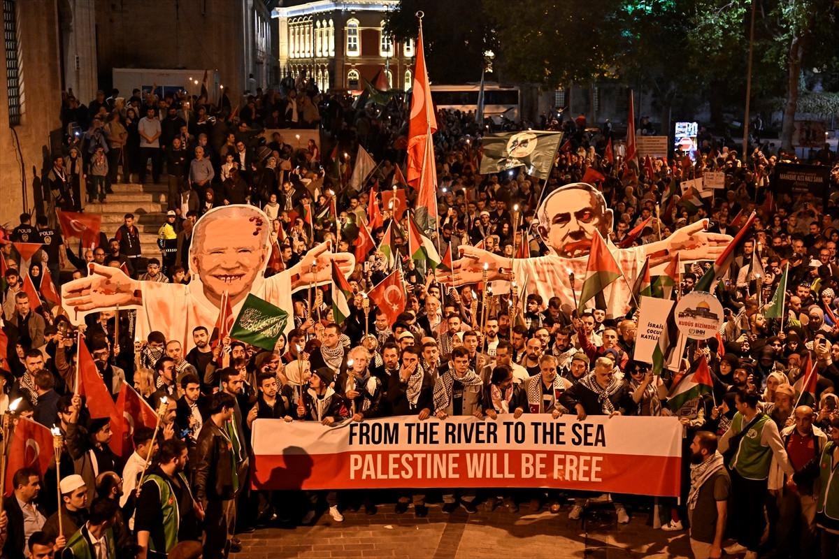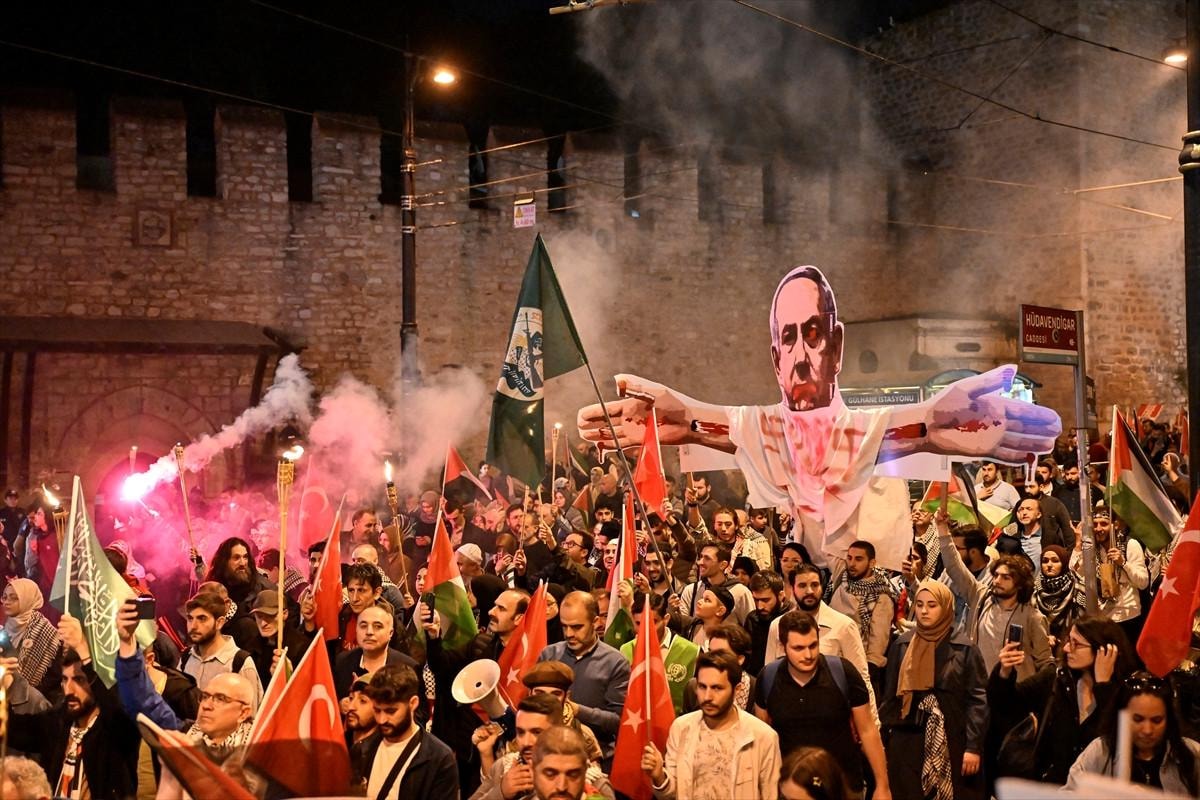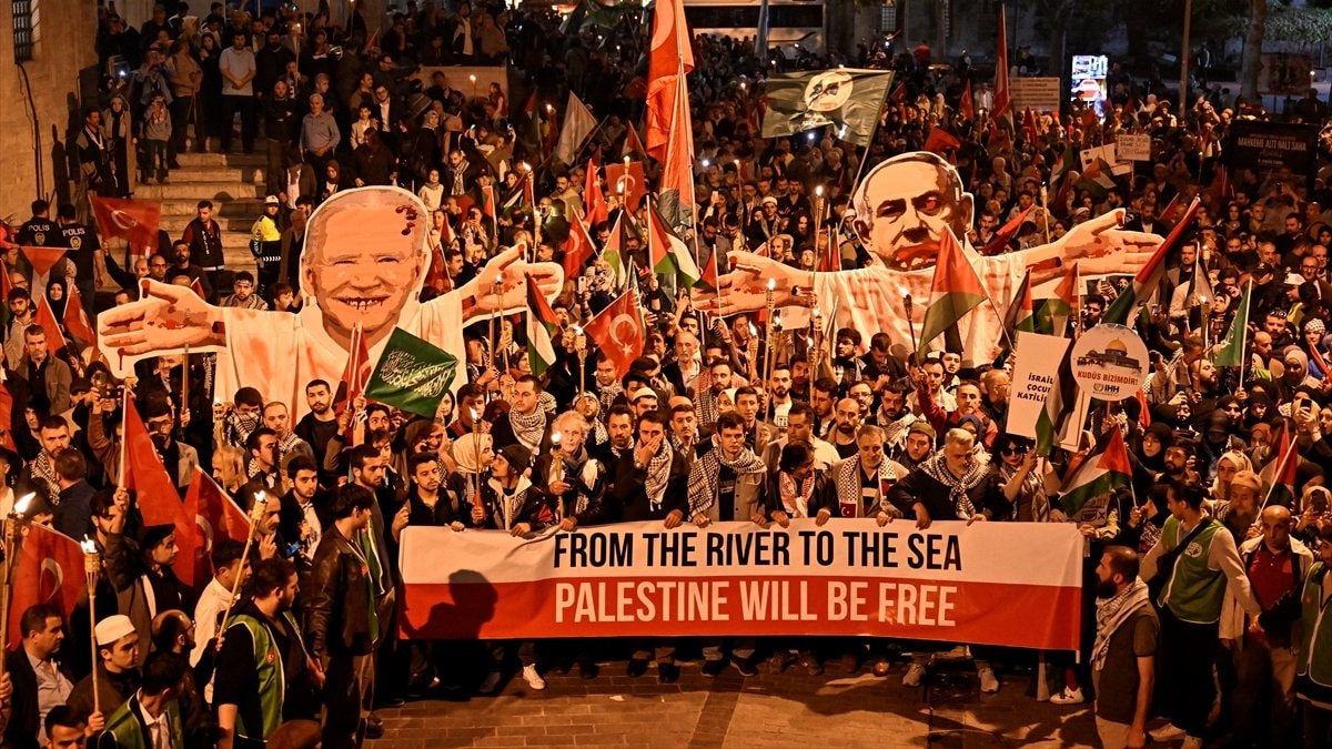 Kalabalık, ABD Başkanı Joe Biden ve İsrail Başbakanı Binyamin Netanyahu'nun maketlerini taşıyarak, Türkçe ve İngilizce sloganlarla İsrail'in Gazze'ye yönelik saldırılarını protesto etti.