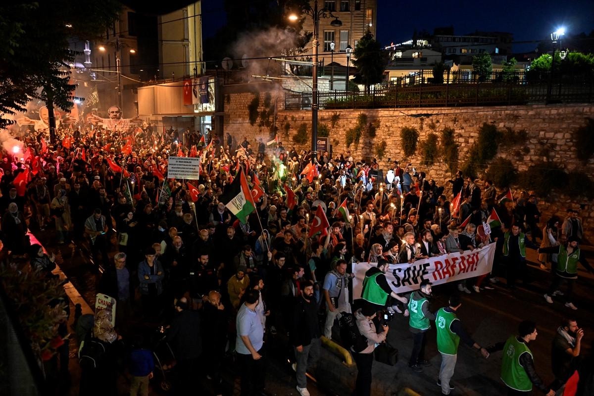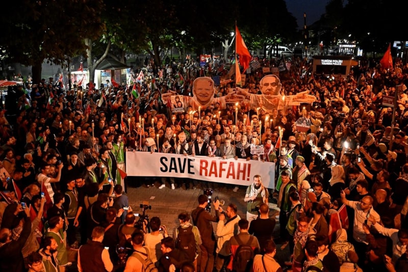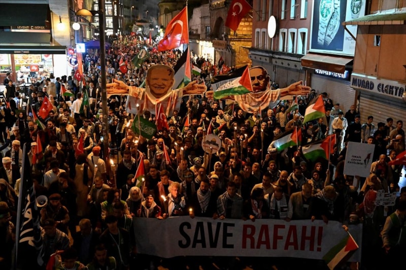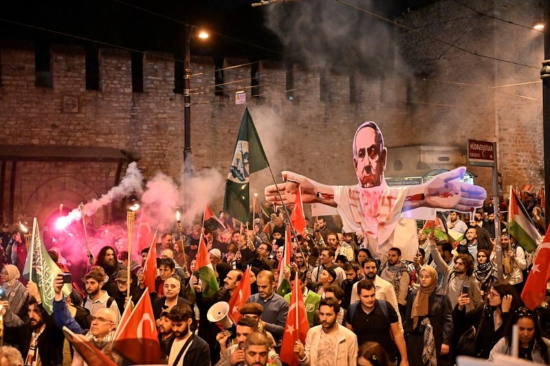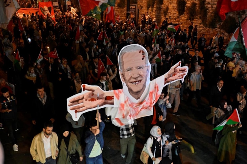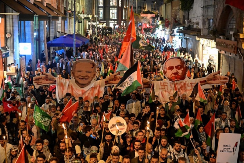 Kalabalık, ABD Başkanı Joe Biden ve İsrail Başbakanı Binyamin Netanyahu'nun maketlerini taşıyarak, Türkçe ve İngilizce sloganlarla İsrail'in Gazze'ye yönelik saldırılarını protesto etti.