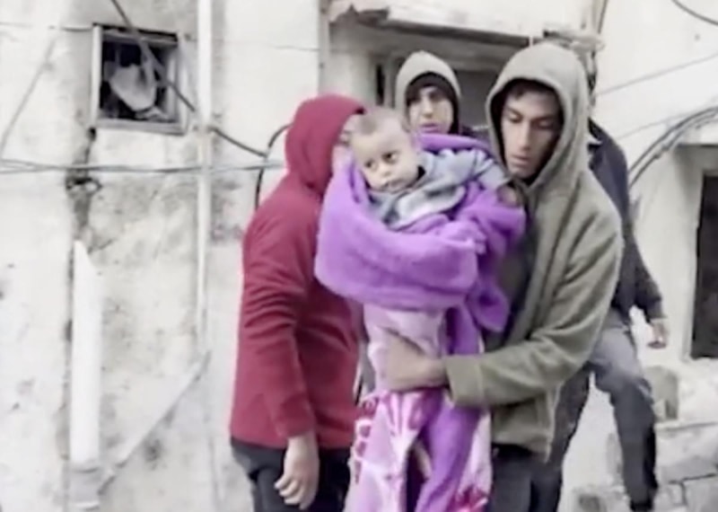 Gazze'nin kuzeyindeki Şifa Tıp Kompleksi yakınlarındaki bir binaya düzenlenen saldırıda, bir bebek hayatta kalmayı başardı.