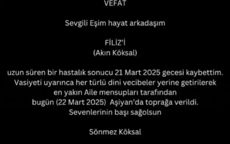 Sönmez Köksal yayınladığı mesajda "Sevgili eşim, hayat arkadaşım Filiz'i (Akın Köksal) uzun süren bir hastalık sonucu 21 Mart gecesi kaybettim. Vasiyeti uyarınca her türlü dini vecibeler yerine getirilerek en yakın aile mensupları tarafından bugün Aşiyan'da toprağa verildi. Sevenlerinin başı sağ olsun..." ifadelerini paylaştı.