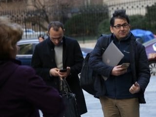 FETÖ üyelerinin sosyal medyada Türkiye aleyhinde karalama kampanyasına dönüştürdüğü duruşmaların cuma günkü bölümünün ardından salonun dışında Periscope’tan yayın da yapan Emre Uslu ile Adem Yavuz Arslan, AA ekibi tarafından görüntülendi.