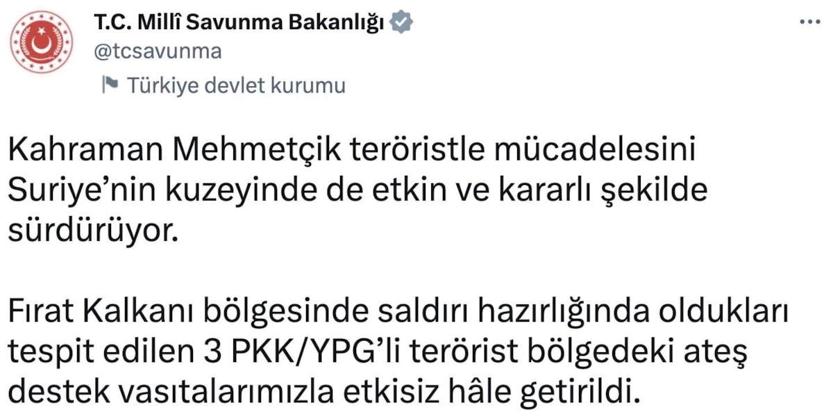 Kahraman Mehmetçik teröristle mücadelesini Suriye’nin kuzeyinde de etkin ve kararlı şekilde sürdürüyor. Fırat Kalkanı bölgesinde saldırı hazırlığında oldukları tespit edilen 3 PKK/YPG’li terörist bölgedeki ateş destek vasıtalarımızla etkisiz hâle getirildi.