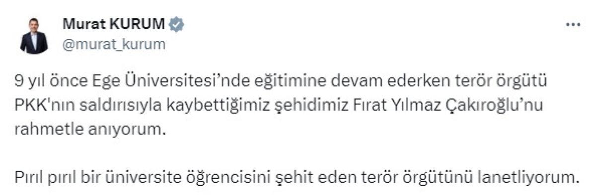 9 yıl önce Ege Üniversitesi’nde eğitimine devam ederken terör örgütü PKK'nın saldırısıyla kaybettiğimiz şehidimiz Fırat Yılmaz Çakıroğlu’nu rahmetle anıyorum.