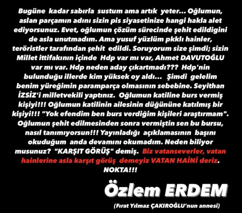 Bugüne kadar sabırla sustum ama artık yeter... Oğlumun, aslan parçamın adını sizin pis siyasetinize hangi hakla alet ediyorsunuz. Evet, oğlumun çözüm sürecinde şehit edildigini de asla unutmadım. Ama yusuf yüzlüm PKK'lı hainler, teröristler tarafından şehit edildi. Soruyorum size şimdi; sizin Millet İttifakı'nın içinde HDP var mı var, Ahmet Davutoğlu var mı var. HDP neden aday çıkartmadı? HDP'nin bulunduğu illerde kim yüksek oy aldı. Şimdi gelelim benim yüreğimin paramparça olmasının sebebine. Seyithan İzsiz'i milletvekili yaptınız. Oğlumun katiline burs vermiş kişiyi! Oğlumun katilinin ailesinin düğününe katılmış bir kişiyi! "Yok efendim ben burs verdiğim kişileri araştırmam". Oğlumun şehit edilmesinden sonra vermiştin sen bu bursu, nasıl tanımıyorsun! Yayınladığı açıklamasının başını okuduğum anda devamını okumadım. Neden biliyor musunuz? 'karşı görüş' demiş. Biz vatanseverler, vatan hainlerine asla karşıt görüş demeyiz 'vatan haini' deriz. Nokta!