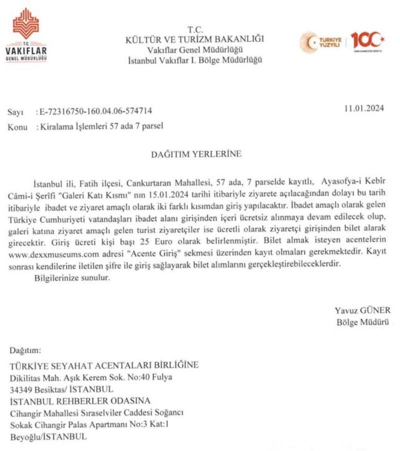 İstanbul ili, Fatih ilçesi, Cankurtaran Mahallesi, 57 ada, 7 parselde kayıtlı, Ayasofya-i Kebîr Câmi-i Şerîfi “Galeri Katı Kısmı” nın 15.01.2024 tarihi itibariyle ziyarete açılacağından dolayı bu tarih itibariyle ibadet ve ziyaret amaçlı olarak iki farklı kısımdan giriş yapılacaktır.
