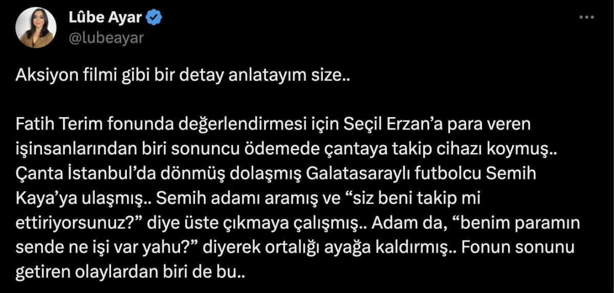 "Fatih Terim fonunda değerlendirmesi için Seçil Erzan’a para veren iş insanlarından biri sonuncu ödemede çantaya takip cihazı koymuş.. Çanta İstanbul’da dönmüş dolaşmış Galatasaraylı futbolcu Semih Kaya’ya ulaşmış.. Semih adamı aramış ve “siz beni takip mi ettiriyorsunuz?” diye üste çıkmaya çalışmış.. Adam da, “benim paramın sende ne işi var yahu?” diyerek ortalığı ayağa kaldırmış.. Fonun sonunu getiren olaylardan biri de bu.."